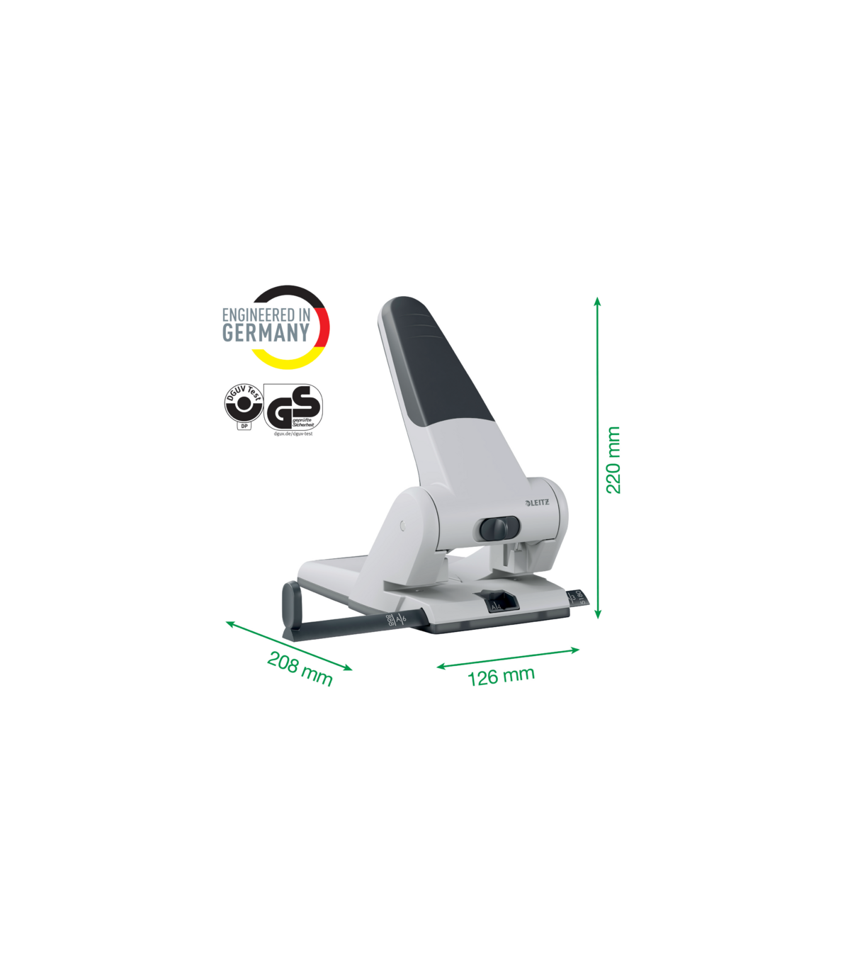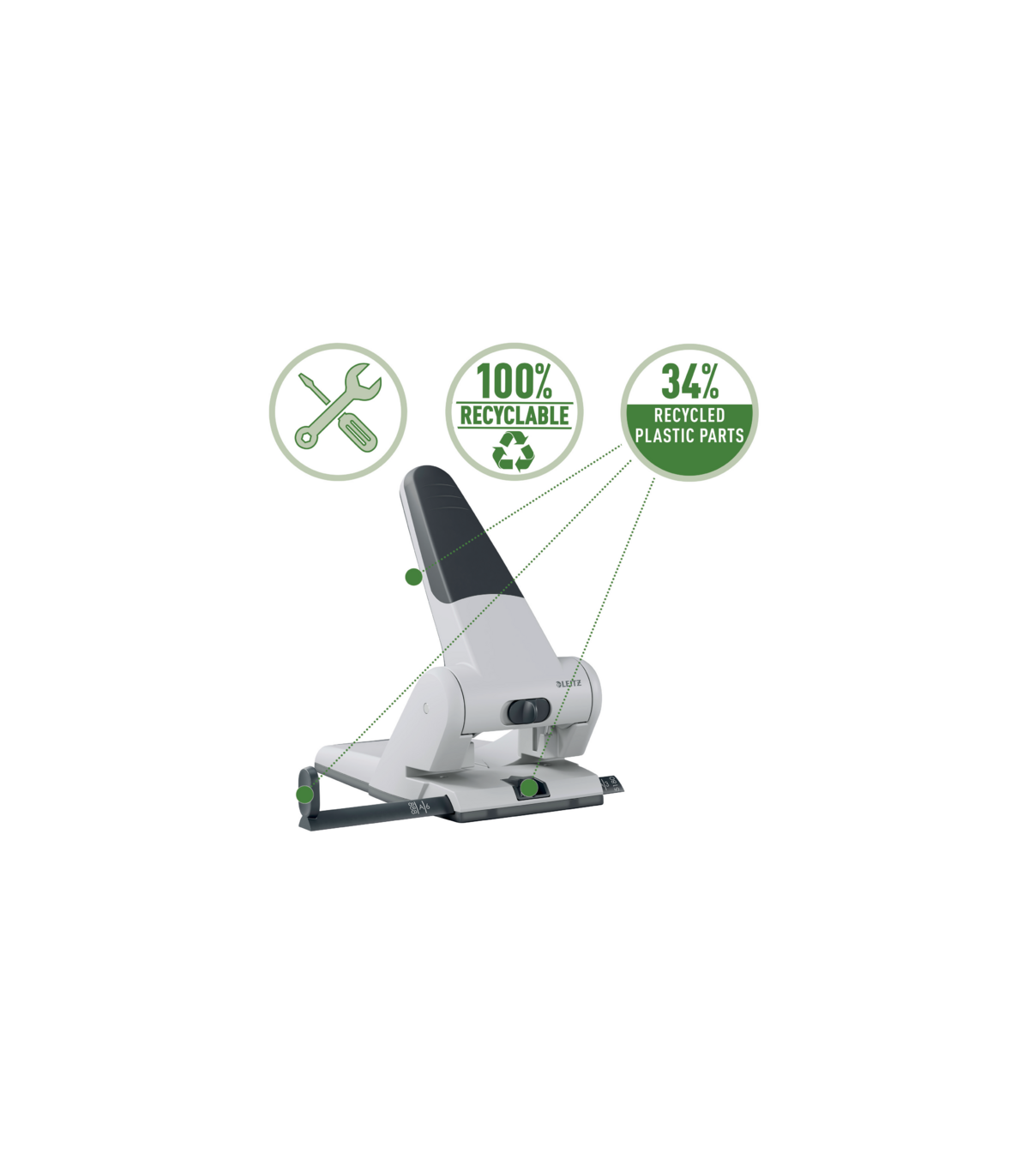 Perforatore a 2 fori di qualità superiore per impieghi gravosi con tecnologia Powersave per punzonare senza fatica fino a 65 fogli di carta (80 g/m²). Questo perforatore robusto e durevole è dotata di un'impugnatura antiscivolo e di una barra guida sicura con marcature chiare fino al formato A3 per garantire una perforazione fluida e precisa. Lo svuotamento della punzonatrice è facile e senza problemi grazie al cassetto di scarico incernierato e la maniglia si blocca per risparmiare spazio. Costruita per durare nel tempo, questo perforatore per impieghi gravosi è realizzato principalmente in a luminio pressofuso con una piccola parte di parti in plastica riciclata post-consumo, riparabile con pezzi di ricambio per prolungare ulteriormente la vita del perforatore. A fine vita è riciclabile al 100% se completamente smontato nei diversi tipi di materiale per ridurre i rifiuti e contribuire a preservare le risorse della terra. Questo perforatore è coperta da una garanzia di 10 anni ed è testato per la sicurezza GS. Sono disponibili prodotti abbinati per soddisfare tutte le esigenze di pinzatura e punzonatura per impieghi gravosi.